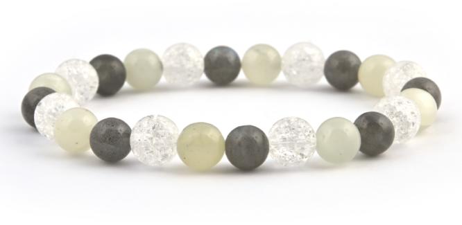 Ehhez az ásvány karkötőhöz 8 mm-es labradorit ( szürke ), jáde és hegyikristály gömböket fűztünk fel duplasoros gumira. Az ásványok nem helyettesítik az orvosi diagnózist és kezelést. A labradorit hatása : a labradorit eloszlatja a félelmet és a bizonytalanságot. Növeli az önmagadba vetett hitet. Hatására új ötleteid támadnak. Gyógyítja a köszvényt és a reumát.
