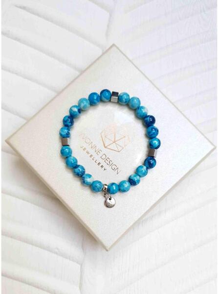 Egyedi tervezésű 6 mm óceánkék jáde és hematit ásványokból készült karkötő, Yvonne design medállal.
