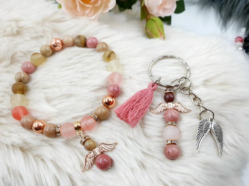 Ékszerszett, mely egy ásványkarkötőből és egy kulcstartóból áll. Matt rózsaopál és rodonit ásványokból készült karkötő, rosegold szín díszítéssel és egy angyal medállal.
