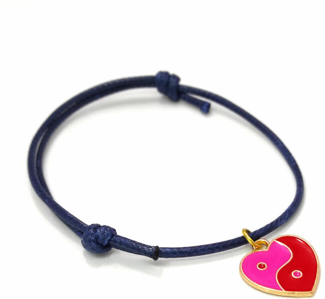 Kék zsinórszövet karkötő pink-piros jin-jang szív charmmal. Paraméterek:. Charm mérete kb. 1,5 cm. Charm anyaga fémötvözet. Karkötő anyaga textil.