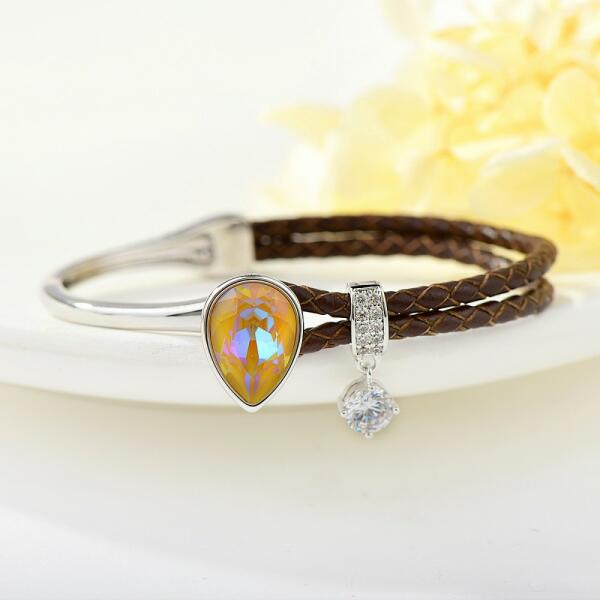 Cikkszám: 0402 Akasztós karperec: - színjátszó pezsgőszínű csepp alakú Swarovski kristállyal, - platina bevonattal, - fonott, sötétbarna bőrszíjjal. Belső átmérők: 5,7 cm és 4,5 cm. (Max. 17,5 cm-es csuklóra jó!) Súlya: 10 g. Alapanyaga: minőségi fémötvözet. Különleges, Swarovski kristályos, exkluzív ékszer! A megadott méreteket kérjük vegyék figyelembe !