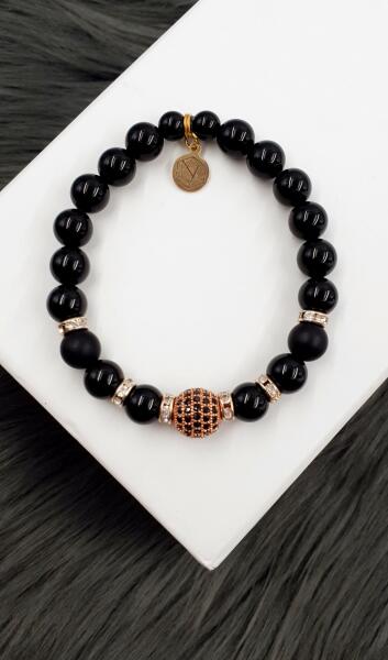 Gyönyörű egyedi LUXURY ásványkarkötő rosegold díszítéssel matt fekete és fényes fekete ónix ásványokból.