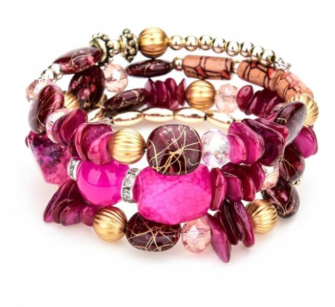 Pink-színes többsoros karkötő. Rugalmas, könnyen felvehető, 20 cm. Akril, kő és fémötvözet. Egy jól megválasztott ékszer öltöztet, feldobja a napodat, valahányszor ránézel, jobb kedvre derülsz. A színekkel és anyagokkal manapság könnyű variálni a különböző stílusokat, nem kell ragaszkodni a hagyományos szettekhez, nem feltétlenül kell a fülbevalót a karkötő va