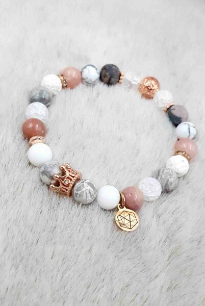 Gyönyörű egyedi Yvonne Design LUXURY ásványkarkötő, mely zebrajáspis, rózsakvarc, howlit ásványokből készült és rosegold szín díszítést tartalmaz, illetve egy 10 mm-es cirkon medált.
