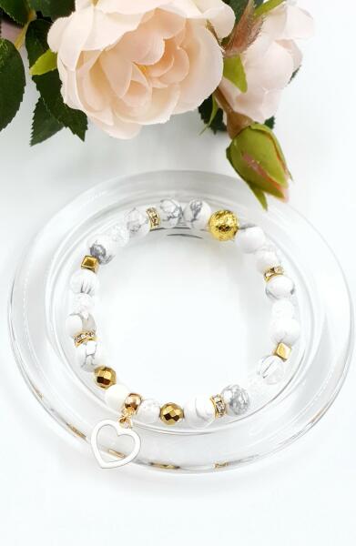 Szívecske medálos howlit kristálykarkötőHowlit és Hegyikristály ásványokból készült karkötő, arany szín díszítéssel és egy szívecske medállal.