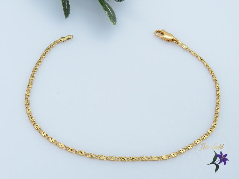 Antiallergén vékony csigaszemes karlánc Szin: 18K Méret: 18,5cm /2mm A forgalmazott divatékszerek alapanyaga nikkel és ólommentes ezért többnyire nem okoznak allergiás tüneteket, nyugodtan hordhatják fémérzékeny emberek is. Általában nem színezik a bőrt és más divatékszerekhez képest nagyságrendekkel jobb kopásállósággal rendelkeznek. A fehér (ezüst) színű ékszerek