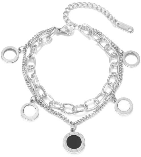 Luna Karkötő Csodszép Luna karkötő verhetetlen áron. A karkötő dupla soros, kör alakú medálok díszítik. Kialakítását Ön is biztosan megkedveli. Az ékszer nem tartalmaz nikkelt, ezért érzékeny bőrű emberek is viselhetik. Tulajdonságok: A karkötő hossza: 16cm + 4cm Anyaga: Nemesacél Szín: Ezüst