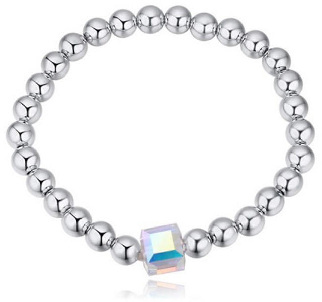 Középen csillogó, kocka alakú, különleges kristállyal ékesített, ezüst színű gyöngyökből fűzött karkötő. Kialakításának köszönhetően felveszi a csukló méretét. Ékszer alapanyaga: nikkelmentes antiallergén fém Mérete: 16 0mm