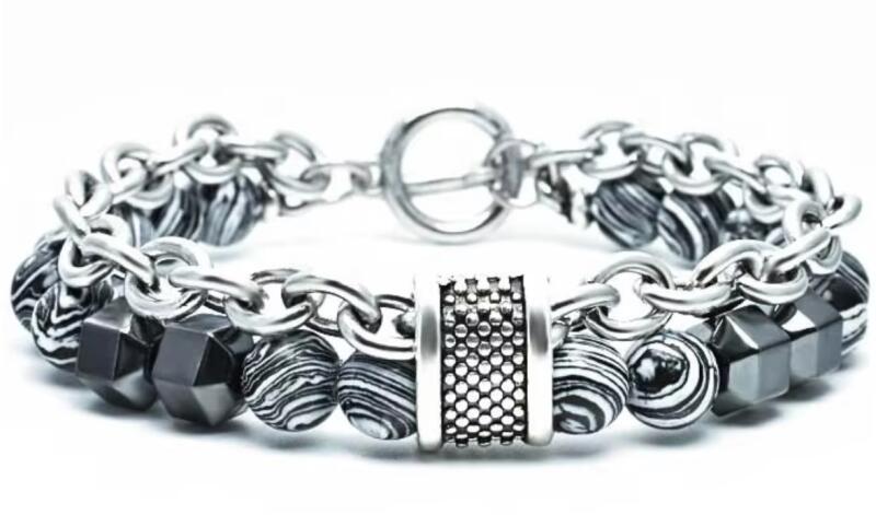 Gabor karkötő Mutatós karkötő színes gyöngyökkel és robusztus fém láncokkal, amely tökéletes kiegészítő azok számára, akik szeretik az egyedi és modern stílust. A fém részletek eleganciát adnak a karkötőnek, míg robusztus felépítése hosszú élettartamot és kényelmes viseletet garantál. Ez a karkötő ideális mindennapi viseletre és különleges alkalmakra, amikor