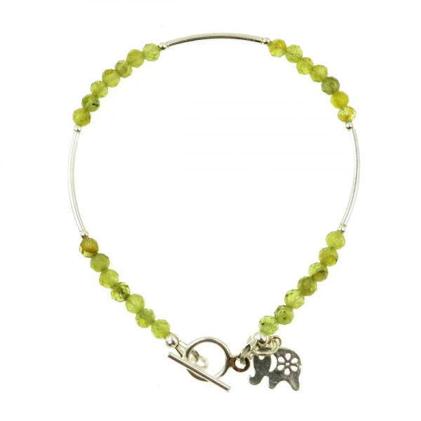 Természetes fazettált olivin (peridot) gyöngy drágakőből készült ezüst karkötő, egykezes "T" kapoccsal, elefánt medállal. Hossza fix, de kérésre egyedi hosszúságban is készítem. Bővebb információ "ADATOK PARAMÉTEREK" fül alatt. Peridot vélt gyógyhatása