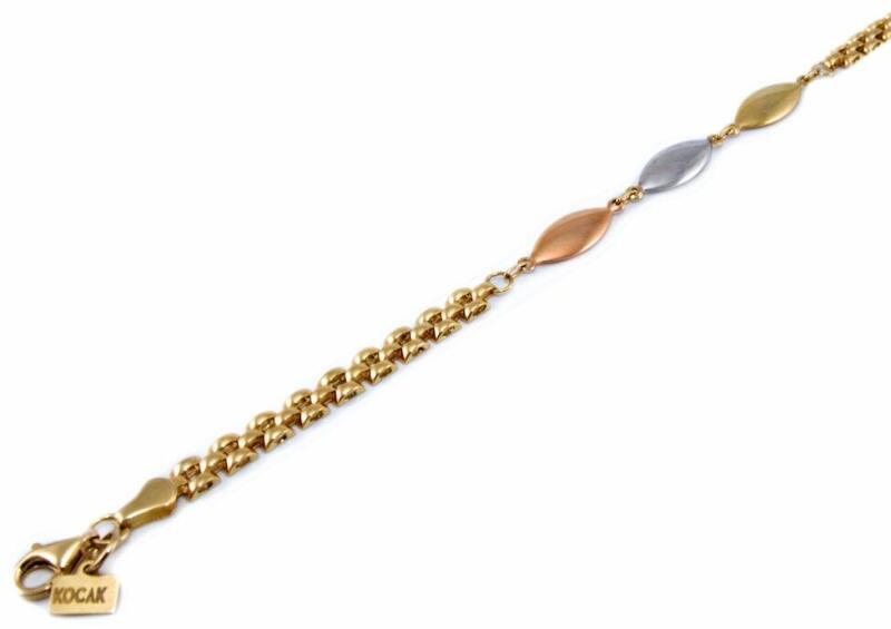 Modern stílusú, különleges fazonú, ródiummal és rosé aranyozással bevont szemekkel díszített, áttört, stiftes háromszínű arany karkötő.