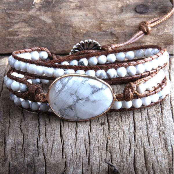 Egyedi, kézzel készült, nagyon finom, igazi elegáns megjelenést kölcsönző howlit ásványból készült többsoros wrap karkötő. A nyári fesztiválok hangulatos, bohó, igazi bohém ékszere. Mivel a drágakövek természetes anyagok, a kő színei és formája kissé eltérhet a képen láthatótól, így ez a gyönyörű, kézzel készített három soros wrap karkötő éppen olyan eg