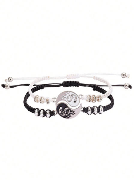 Ez egy kézzel készített fonott fekete-fehér karkötőpár, amely az ikonikus Yin és Yang szimbólumot ábrázolja. A karkötők egyik fele fekete, a másik fele fehér, és középen egy ezüstszínű medál található, amelyen a Yin és Yang motívum látható, tűz és víz stilizált ábrázolásával. A karkötők állítható zsinórosak, így különböző csuklóméretekhez is könnye