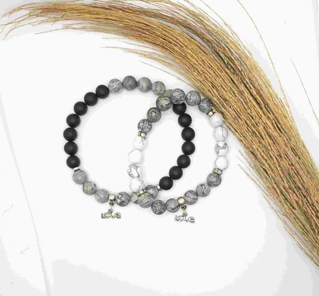 Gyönyörű egyedi karkötőpár 8 mm ónix, márványos howlit, zebrajáspis ásványgyöngyökből készült, love medállal. Az ár egy pár (2db) karkötőre vonatkozik.