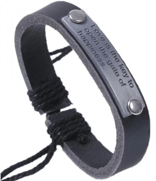Citation karkötő Fekete színű karkötő, elegáns "Love is the key to open the gate of happiness" (A szerelem a boldogság kapujának kulcsa) felirattal, ideális kiegészítő azok számára, akik hisznek a szerelem és a pozitív gondolatok erejében. Kiváló minőségű bőrből készült, ez a karkötő nemcsak tartós, hanem stílusos és kényelmes is viselni. A karkötőt úgy tervezt
