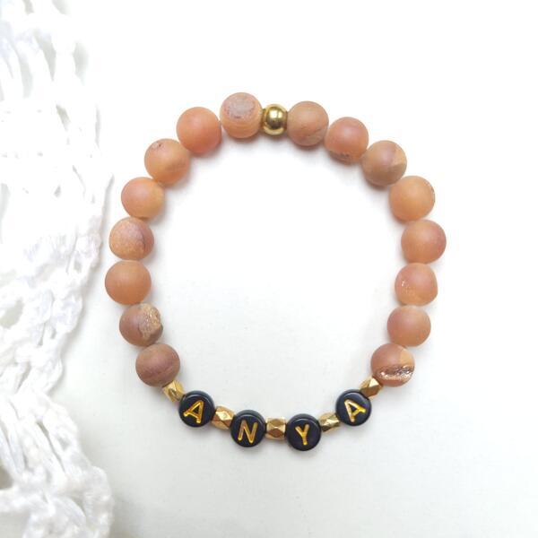 ANYA feliratos ásványkarkötő, fekete betűgyöngyökből és matt csillogó achát kristály ásványokból.