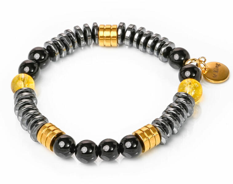 Gyönyörű achát, citrin és hematit karkötő, különleges aranysárgák és fekete kombinációja, speckó hematit hengerekkel, amitől még vagányabb az ékszer. Határozott, erőteljes stílus, mégsem túl rideg, pont jó férfiaknak és bevállalós csajoknak. Fantasztikus kontrasztot ad az achát sötétje a citrin élénk színével. Figyelem! A képen exkluzív kivitelű, rugalmas kar