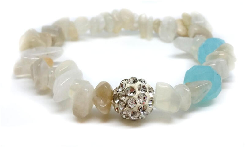 Angelit ásvány golyókból fűzött gumis karkötő. Csökkenti a fertőzésveszélyt, enyhíti a torokgyulladást és jótékonyan hat az ödémákra, mert serkenti a nyirokkeringést és a veseműködést. Fokozza a közösségi érzést és a harmóniát. Az angelitet angyalkőnek is nevezik (latinul az angelus „angyalt jelent). Világosság és a szeretet szimbóluma. Nikkelmentes ékszer.