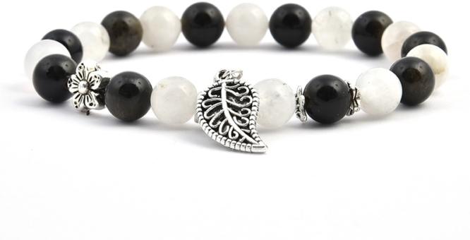 A szivárvány holdkő és az ezüstfényű obszidián 8 mm-es gömbjeiből fűzött gumis karkötő. Díszítő elem : 1 db 8 mm-es hegyes levelű virág. 2 db 6 mm átmérőjű golyósapka és 1 db 18x10 mm-es ezüst színű levél. A karkötő méretének meghatározása : a csuklód méretéhez adj hozzá kb. 1,5 cm-t. KÉRLEK VÁLASSZ MÉRETET ! Az ásványok nem helyettesítik az orvosi diag