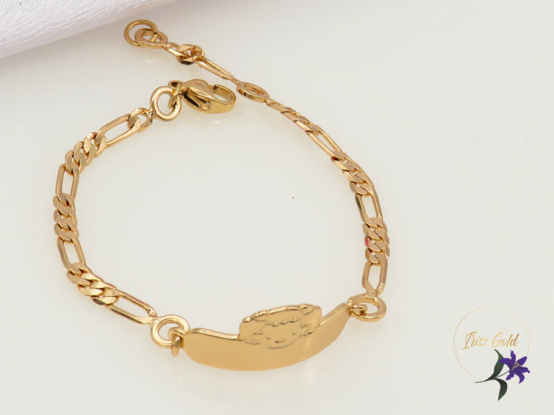 Gold Filled gyermek karkötő középen 25x10 mm köztes kislány fejjel díszítve Szin: 18K Méret: 15-18 cm lánc 3 mm Gravírozást mindenki csak sajátfelelősségére tegyen bele! A forgalmazott divatékszerek alapanyaga nikkel és ólommentes ezért többnyire nem okoznak allergiás tüneteket, nyugodtan hordhatják fémérzékeny emberek is. Általában nem színezik a bőrt és más divat