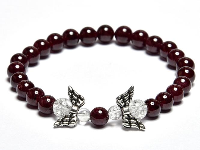 A karkötő 8 mm-es mélybordó gránát gömbökből és 6 illetve 8 mm-es repesztett hegyikristályból készült, gyöngyfűző gumira fűzve. A karkötő méretének meghatározása : a csuklód méretéhez adj hozzá kb. 1,5 cm-t. Az ásványok nem helyettesítik az orvosi diagnózist és kezelést. A gránát hatása : a gránát magában hordozza az élet szeretetét és a szenvedélyt. Seg