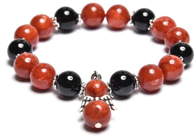 A karkötő 10 mm-es korall és ónix gömbökből és 6 mm-es antiallergén, ezüst színű golyókosárból készült gyöngyfűző gumira fűzve. Az angyalka 8 és 10 mm-es korallgömbből áll. A karkötő méretének meghatározása : a csuklód méretéhez adj hozzá 2 cm-t. Az ásványok nem helyettesítik az orvosi diagnózist és kezelést. A korall ékszer ne érintkezzen semmilyen vegyi