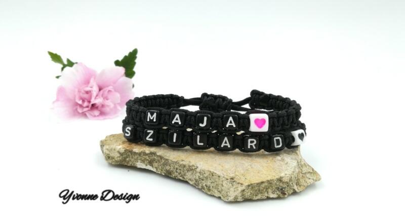 Gyönyörű egyedi, szabadon választható névvel ellátott karkötő, mely vékony parakord zsinórból font és fekete betűket tartalmaz, plusz egy pink és egy fekete szívecskét a név után. A neveket, amit a karkötőn szeretnél látni, a vásárlás végén a megjegyzés rovatban add meg nekünk, ami max 7 karakter tud lenni.