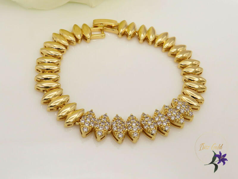 Aranysárga színű karkötő, melyet fehér és rózsaszín cirkónia kristályok tesznek csillogóvá. A kristályok karmos foglalatban helyezkednek el, a karkötő elülső harmadát díszítik. Időtálló ékszer, nem feketedik víz hatására sem. Mindennapi használatra is tökéletes választás. Antiallergén ékszer. 14K arany színben kapható. Karkötő szélessége: 4 mm és 7 mm. Az