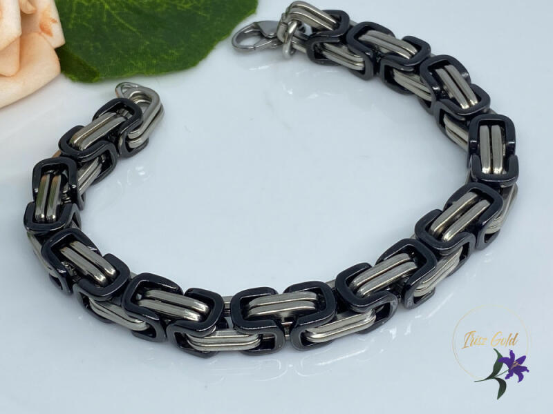 Vastag szemekből álló nemesacél karkötő Szin: Fekete és rodium Méret: 21 cm /10mm A forgalmazott divatékszerek alapanyaga nikkel és ólommentes ezért többnyire nem okoznak allergiás tüneteket, nyugodtan hordhatják fémérzékeny emberek is. Általában nem színezik a bőrt és más divatékszerekhez képest nagyságrendekkel jobb kopásállósággal rendelkeznek. A fehér (ezüst)