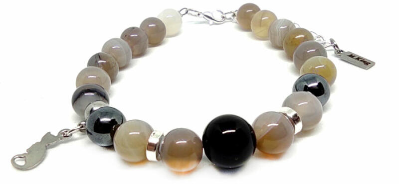 A ónix ásvány golyók gumira vannak felfűzve. Amit az ónixról érdemes tudnod: Az ónix általában fekete, néha előfordulhat fehér, szürkés csíkozódással is. Lelki gyógyhatása: Az ónix egy védelmező kő, amely a negatív energiák ellen véd. Csökkenti a befolyásolhatóságunkat, növelve így az önbizalmunkat, egészséges egónkat. Egyensúlyba hozza a külsőnket és bels