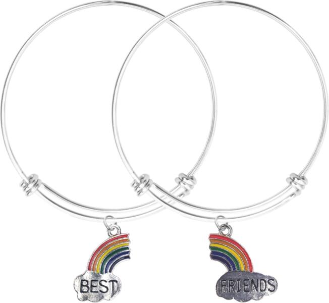 Átmérője 6 cm. Valamelyest rugalmasan felvehető, nem nyitható, tehát a kézfej is átbújik a karperecen. Kb. 17-18 cm-es körméretű csuklóig ajánlott. Legjobb Barátok páros Szivárvány medál ezüst színű karperecen, 2 db. Paraméterek:Medál / mérete kb. 2 cm. Medál anyaga fém ötvözet. Karperec anyaga rozsdamentes acél.