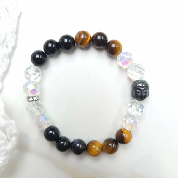 Őszi hangulatú buddhafej kristálykarkötő. Egyedi tervezésű tigrisszem, üveg kristály, és ónix ásványokból készült buddhafej medállal.