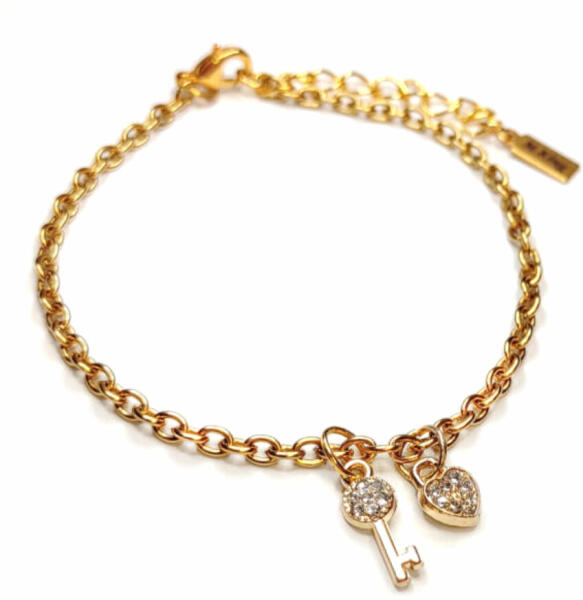 Kristály kulcs és lakat charmos arany színű karkötő. Paraméterek: Charm mérete 1,4 cm és 0.8 cm. Anyaga fémötvözet és kristály, karkötő anyaga rozsdamentes acél. Karkötő mérete 17+5 cm. (Ha ettől eltérő méretet szeretnél, rendeléskor a MEGJEGYZÉSBE írd be. )