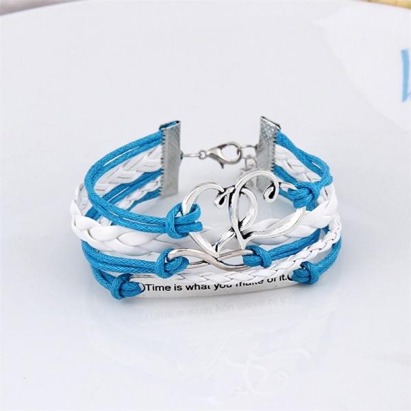 Többsoros karkötő fonott kék és fehér színű bőrrel. Trendi ékszer, elegáns és alkalmi és mindennapi öltözethez. TULAJDONSÁGOKkét szív egymásba fonódik TIME IS WHAT YOU MAKE felirattal állítható méret, kapcsosMÉRETEKkarlánc hossz: állítható: 18,5 -22,5 cm-ig
