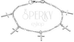 925-ös ezüstből készült karlánc, egy hosszúkás és három rövidebb láncszemből kombinálva. Öt darab hosszúkás szemhez latin kereszt alakú függők vannak kapcsolva. Delfinkapocs zárás. A keresztek méretei: 8 x 12 mmA karkötő hossza: 192 mmA karkötő súlya: 4,0 gFémjelzéssel ellátott.