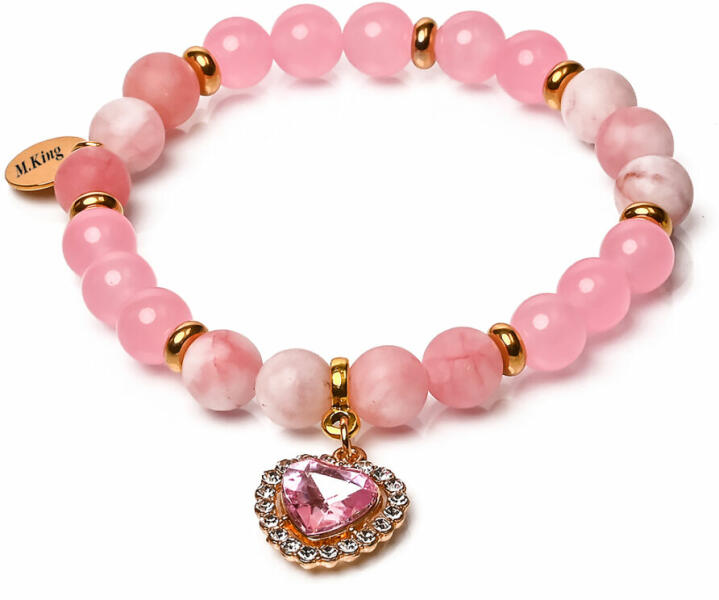 A karkötő 8 mm-es riolit, rutilkvarc és jáde ásvány gömbökből készült gumira fűzve. A felhasznált fém alkatrészek antiallergének : egy futó ló medál. két fűzhető kicsi tök, 4 mm-es strasszgyűrű, 6 mm-es fűzhető virág, egy szív formájú medál " Made with love" felirattal és egy virág mintás hordó. A karkötő méretének meghatározása : a csuklód méretéhez ad