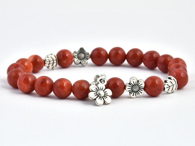 A korall 8 mm-es gömbjeiből, gumira fűzött karkötő. A díszítő elem : fűzhető virág 8 mm-es, 7 mm-es falevél és 13x10 mm-es virág medál. A korall ékszer ne érintkezzen semmilyen vegyi anyaggal, ugyanis a köztes részeket gyantával szokták a gyártók kitölteni, hogy ne legyen érdes, de a gyanta savas vagy lúgos anyagokkal érintkezve kioldódik. A karkötő méretének megha
