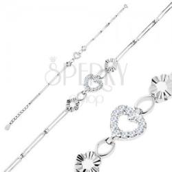 925 ezüst karkötő fényes, vékony elemekből, amelyek hosszúkás alakúak és vékony kivágás a közepén. A díszített részt két virág körvonal vésetekkel alkotja, amelyek között szív alak kirakott cirkóniákkal található. Állítható hossz, delfinkapoccsal viselhető. Dísz rész mérete: 36 x 10 mmSzélesség: 2 mmHossz: 180 mmA hosszabítható rész mérete: 25 mmSúly: 5,9