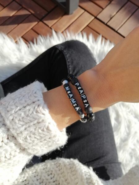 Gyönyörű egyedi tervezésű ónix és lávakő ásványokból készült "PAPA&MAMA" feliratos karkötőpár, egyedi korona medállal. A női karkötő ásványgyöngyei 6 mm, a férfié 8 mm. A karkötő az összetartozást és hűséget jelképezi a nagyszülők között. Az ár egy pár (2db) karkötőre vonatkozik.