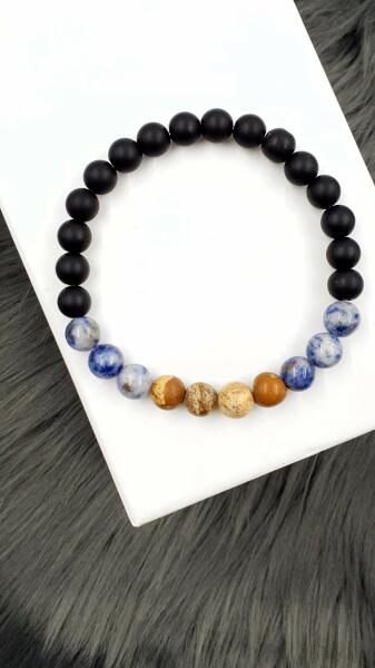 Gyönyörű egyedi férfi karkötő, mely fekete ónix, hegyikristály, szodalit és képjáspis ásványokból lett készítve. Ezen ásványok kombinációjának védő és erősítő hatása van. Ónix hatása: energia, védő, stabilitás, kitartás, stresszoldó Jáspis hatása: védő, emésztőrendszer, ivarszervek, vérkeringés, stresszoldó, auratisztító Szodalit hatása: mesterkristá