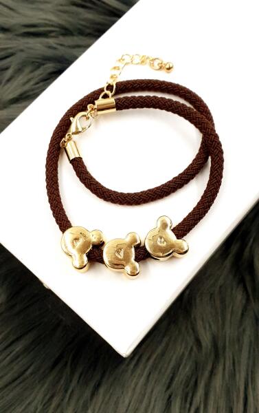 Dupla soros aranyszín, 3 db Minnie fejet tartalmazó karkötő, barna zsinórral A méretük állítható 18 cm-28 cm között.