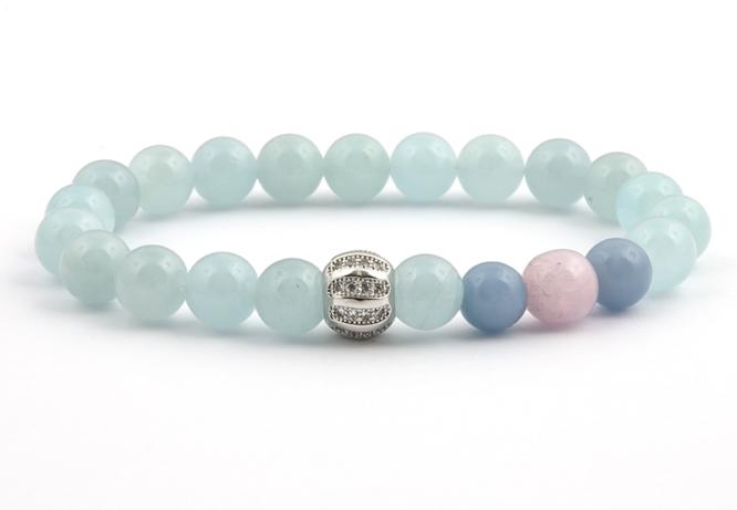 A karkötő 8 mm-es akvamarin, kunzit és angelit gömbök felhasználásával készült. Díszítő elem : 1 db 10 mm-es bordázott strasszgolyó. A karkötő méretének meghatározása : a csuklód méretéhez adj hozzá kb. 1,5 cm-t. Az ásványok nem helyettesítik az orvosi diagnózist és kezelést. Az akvamarin hatása : az akvamarint már a középkorban a testi épség és házasság vé