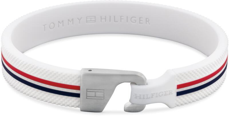 Tommy Hilfiger férfi karkötő típusa 2790607. Divatos férfi karkötő aTommy Hilfiger márkától, fehér szilikonból készült, kiegészítve az ismerős trikolórral, az acél kampót a márka logója díszíti, a karkötő hossza: 19 cm,
