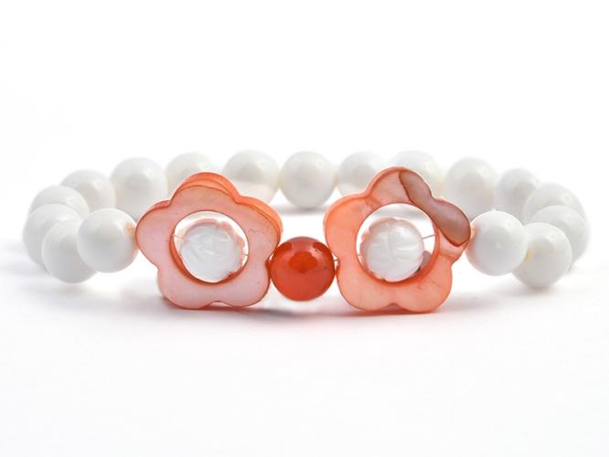 A karkötő 8 mm-es sima és lótuszvirág-mintás kagylóhéjból, valamint narancssárgára festett 18 mm-es kagylóhéj virágból és 8 mm-es karneolból készült. A kagylóhéj virágokon megfigyelhetők ( a képen a jobb oldali virág felső részénél ) barna részek, amelyeket a festék nem úgy fogott be, mint a fehér részt, így árnylatbeli különbségek vannak. A karkötő méret
