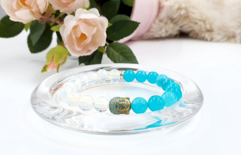 Gyönyörű Buddha fejes ásványkarkötő kék kvarc, holdkő ásványokból, gyönyörű antikolt buddhafej medállal.