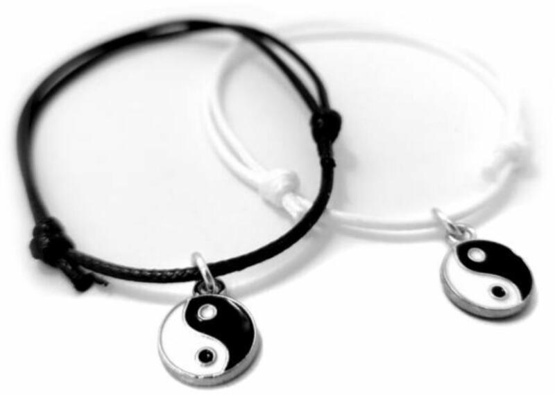 Fekete és fehér zsinórszövet karkötő jin-jang charmmal, 2 db. Paraméterek:. Charm mérete kb. 1,5 cm. Charm anyaga fémötvözet. Karkötő anyaga textil.
