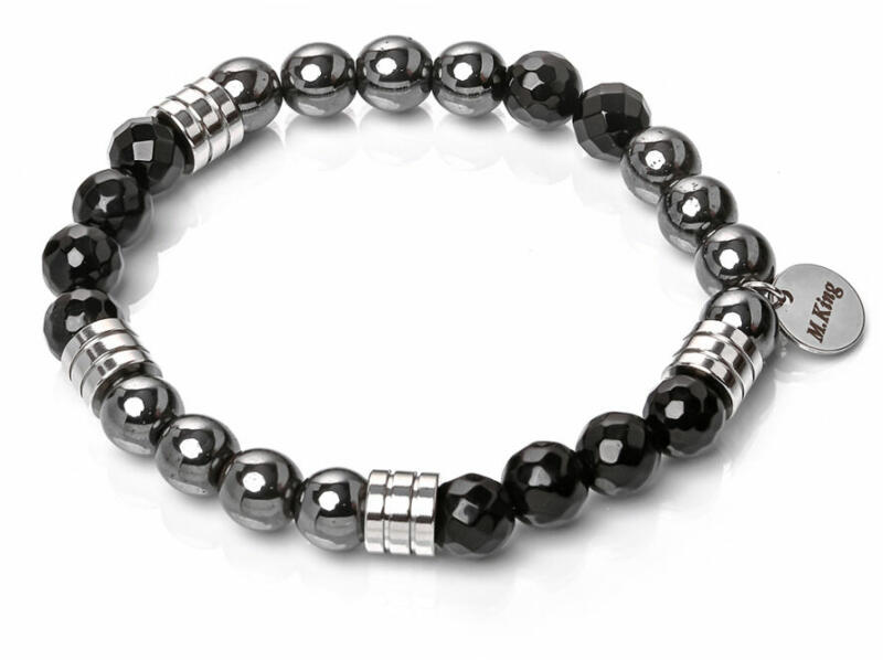 Erőteljes stílusú ónix achát és hematit karkötő, vagány, erőteljes ékszer. A Maria King kollekció kiemelkedő darabja. Különleges erőt árasztó ékszer. Figyelem! A képen exkluzív kivitelű, rugalmas karkötő látható kapocs nélkül, de kérheted extra erős acélsodronyra is delfinkapoccsal és 5 cm hosszabbítólánccal. Ha a kapcsos verziót kéred, ami nem szakad, nem nyú