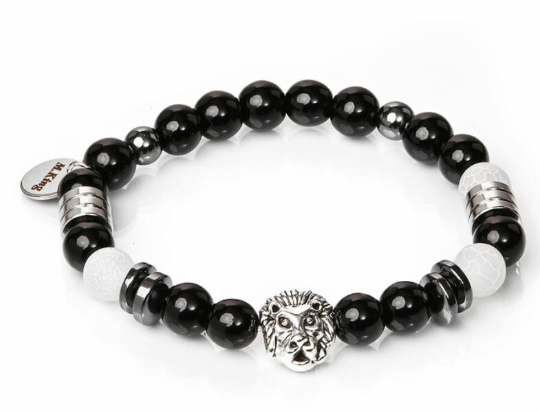 Gyönyörű ónix, hematit és achát karkötő, különleges fehér és fekete kombinációja, megkoronázva egy remekül kidolgozott Oroszlánfej dísszel. A fekete és fehér kontrasztja még erőteljesebbé teszi ezt az amúgy is királyi ékszert. Ha oroszlánfej dísz nélkül kéred a karkötőt, írd be megjegyzésbe! Figyelem! A képen exkluzív kivitelű, rugalmas karkötő látható kap