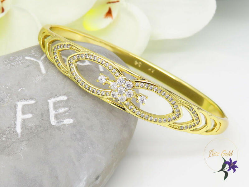 Gyönyörű Gold Filled nyitható karperec. Szépen kidolgozott fehér cirkóna kövekkel díszítve Szin: 14K Méret: 54 Szélesség 1 cm A forgalmazott divatékszerek alapanyaga nikkel és ólommentes ezért többnyire nem okoznak allergiás tüneteket, nyugodtan hordhatják fémérzékeny emberek is. Általában nem színezik a bőrt és más divatékszerekhez képest nagyságrendekkel jobb kop