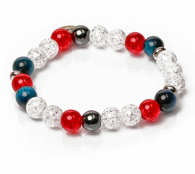 Figyelem! Nem szakad, nem nyúlik! Tartós ékszer. Kérheted csat nélküli rugalmas gumidamilra is. Amennyiben rugalmas damilra kéred, Megjegyzésbe írd be rendeléskor, hogy csat helyett rugalmas gumidamilt kérsz, és a csuklód körbemért méretét is írd meg. Az ékszer ásványai és tartozékai: – 8 mm-es és 10 mm-es piros roppantott hegyikristály ásványok – 8 mm-es fehér